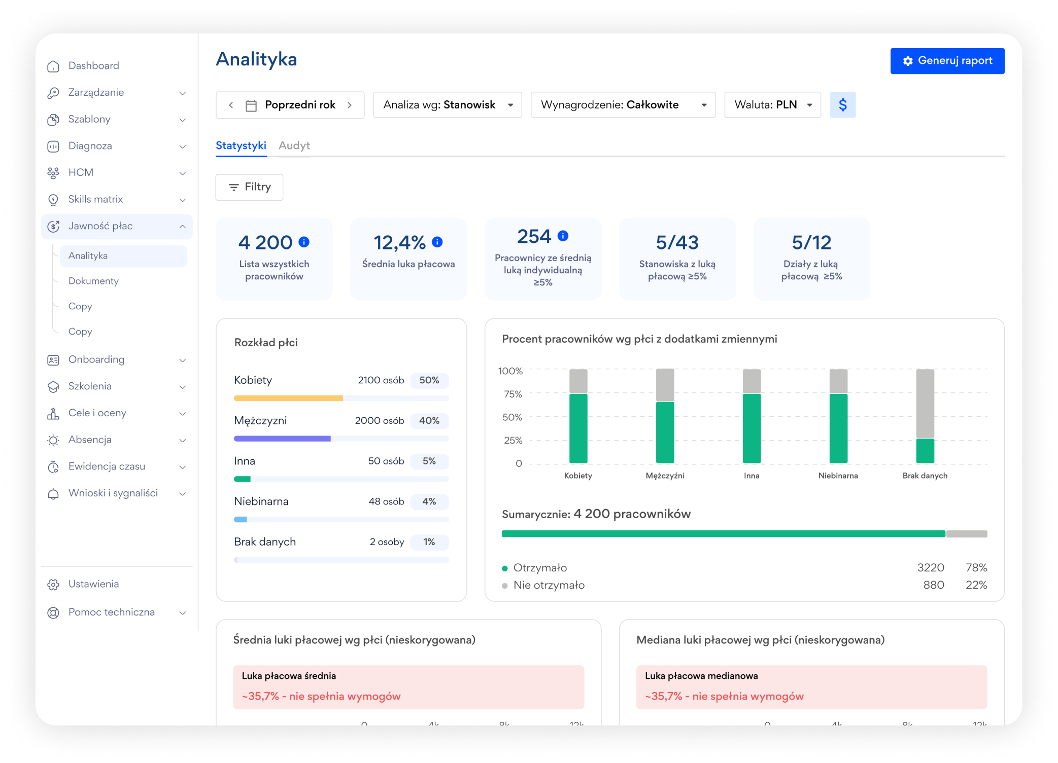 - Identyfikacji i monitorowaniu luki płacowej z uwzględnieniem płci, stanowisk, poziomów organizacyjnych oraz jednostek biznesowych;