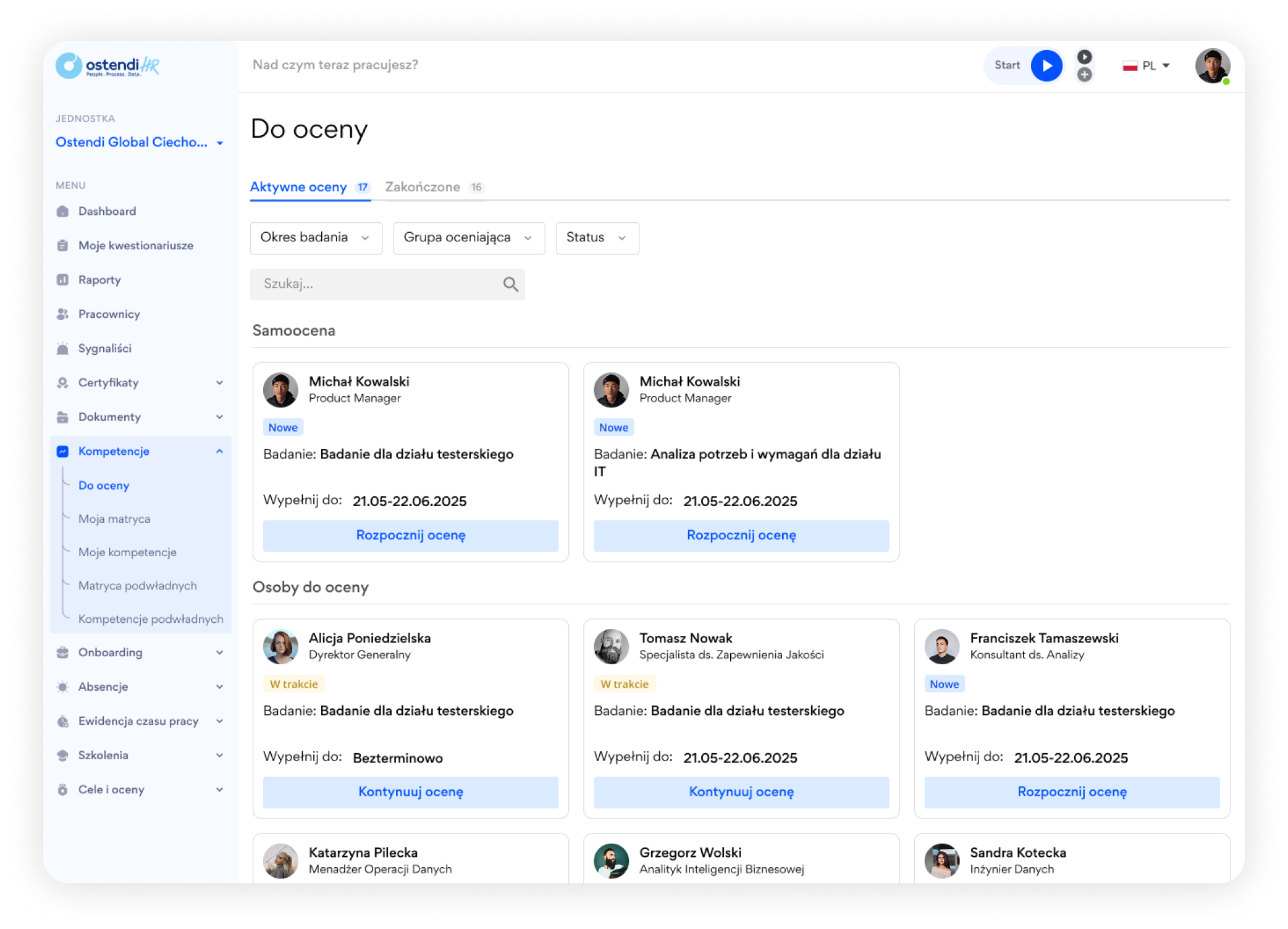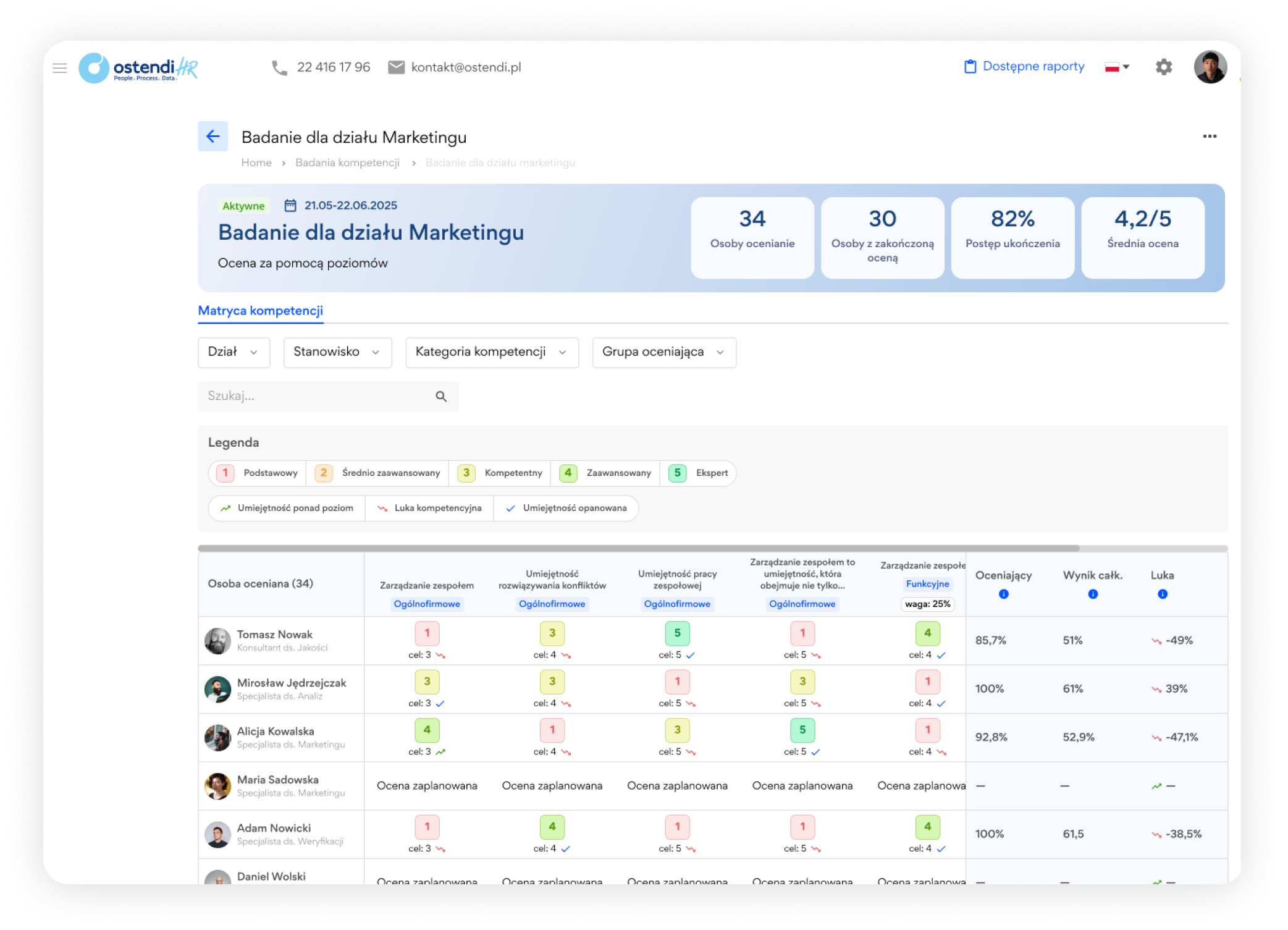Moduł umożliwia błyskawiczne filtrowanie i wyszukiwanie osób z konkretnymi kompetencjami. To znacznie przyspiesza alokację zadań, tworzenie zespołów projektowych czy wyszukiwanie kandydatów do nowych ról.